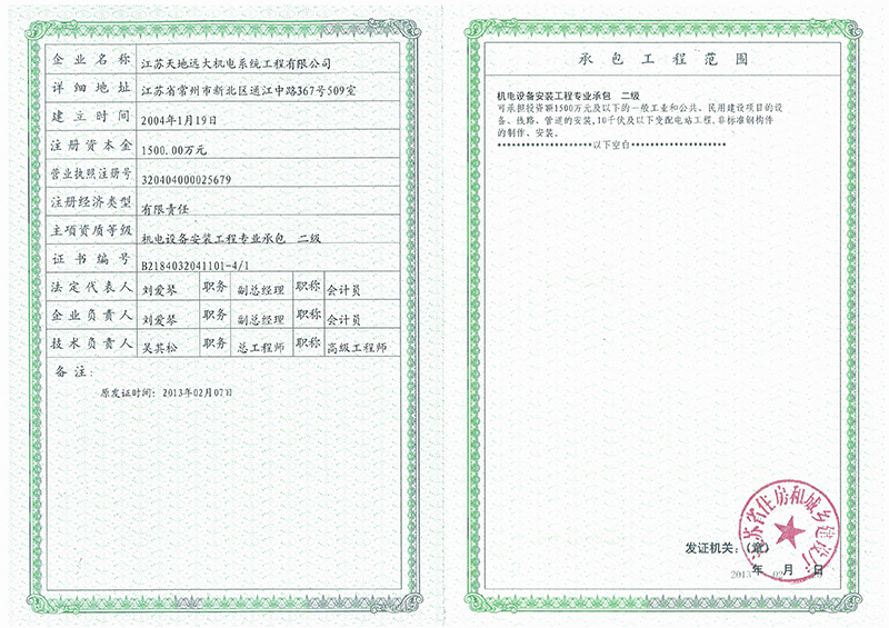 2013年2月20日,通過全體員工的共同努力,公司的資質(zhì)升級(jí)取得了圓滿成功。在原有的機(jī)電設(shè)備安裝工程專業(yè)承包叁級(jí)的基礎(chǔ)上取得了機(jī)電設(shè)備安裝工程專業(yè)承包貳級(jí)的資質(zhì)。此次資質(zhì)等級(jí)的提升,使江蘇天地遠(yuǎn)大機(jī)電系統(tǒng)工程有限公司的資質(zhì)等級(jí)和專業(yè)水平又上了一個(gè)新臺(tái)階,進(jìn)一…